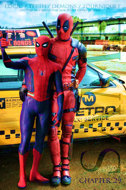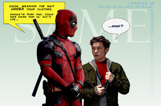 "Okay!" Deadpool said loudly and Peter bodily flinched again at the suddenness of it, thinking back to Deadpool's comment about jumping spiders and hating how that lame joke felt so fitting right then. He was just beginning to step backwards to take his leave and start the long trek home, when Deadpool said,