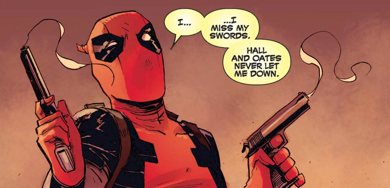 The man -DP, so probably Deadpool- raised his arm, hand open, to the man and yelled back,