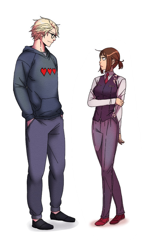 Today he had on a simple vest over a shirt that was clearly too small, as the sleeves were cuffed because they couldn’t reach down to his wrists. The vest was also a cover for the bottom of the shirt, as it slipped out of his slacks every time he moved. She shook her head and tsked. “You’re going to need to update your wardrobe. That shirt looks like it’s more my size.” She joked when she saw his expression fall.