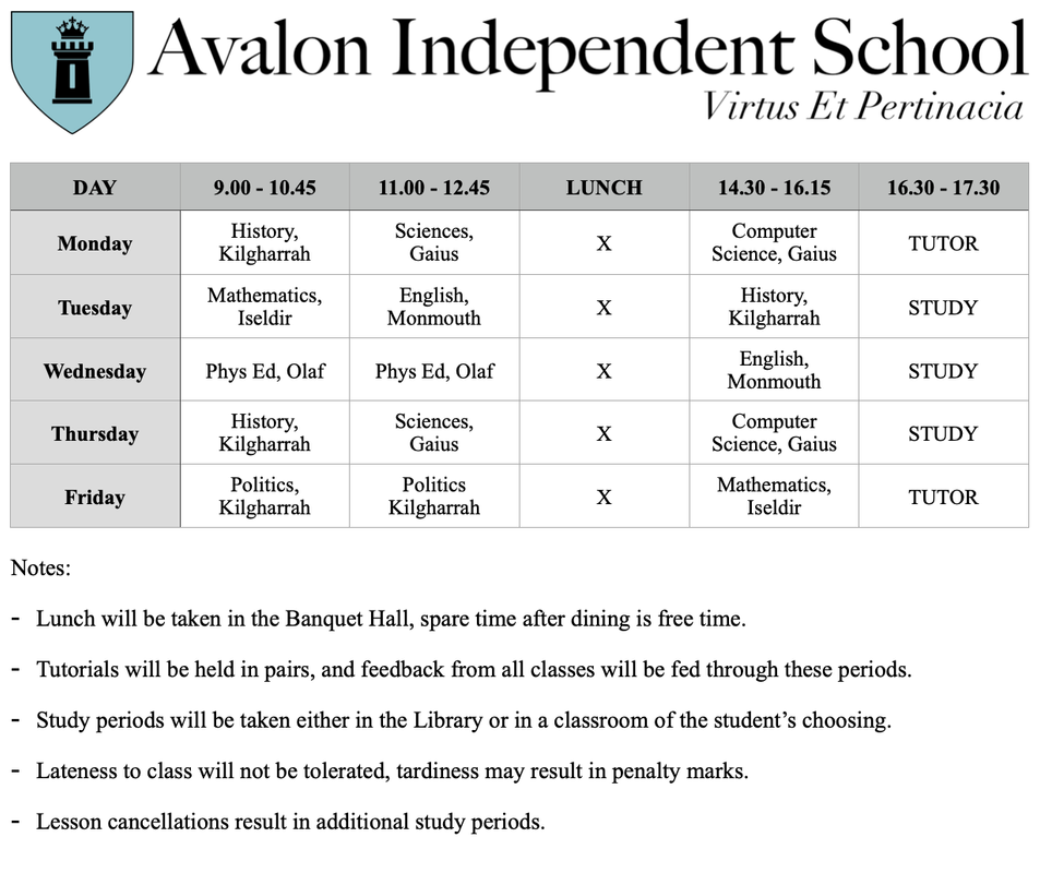 I cannot begin to put into words my excitement that you shall be joining Avalon Independent School for Boys this year in the Upper School. It is our privilege to be able to offer someone of your talents a place at our prestigious college. I understand that this change is likely to be a major challenge for you, but we hope that you settle into the school in a seamless transition. Please find enclosed in this letter the results of your entrance exams, and your weekly timetable for the coming year. If you require any assistance or would like to discuss or propose any changes, please do not hesitate to contact Dr Gaius, our Student Guardian and Head of Sciences.