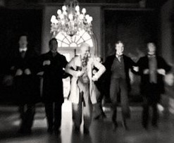 [image: a group of men dancing the gavotte, all dressed in black with the exception of one man dressed in white, who is dancing in the centre]
