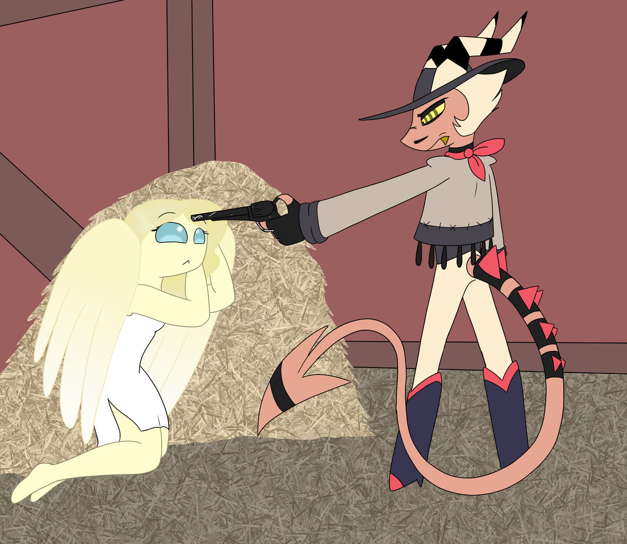 "You misunderstand," the angel finally spoke, lifting herself from the haystack slowly with her hands in the air to avoid provoking the imp into shooting, "I've never seen someone like you." When the angel stood at full height, she easily towered over the imp cowboy before her. "I've seen a lot of interesting looking people down here, but I don't think I've ever met anyone, sinner or imp, like you before."
