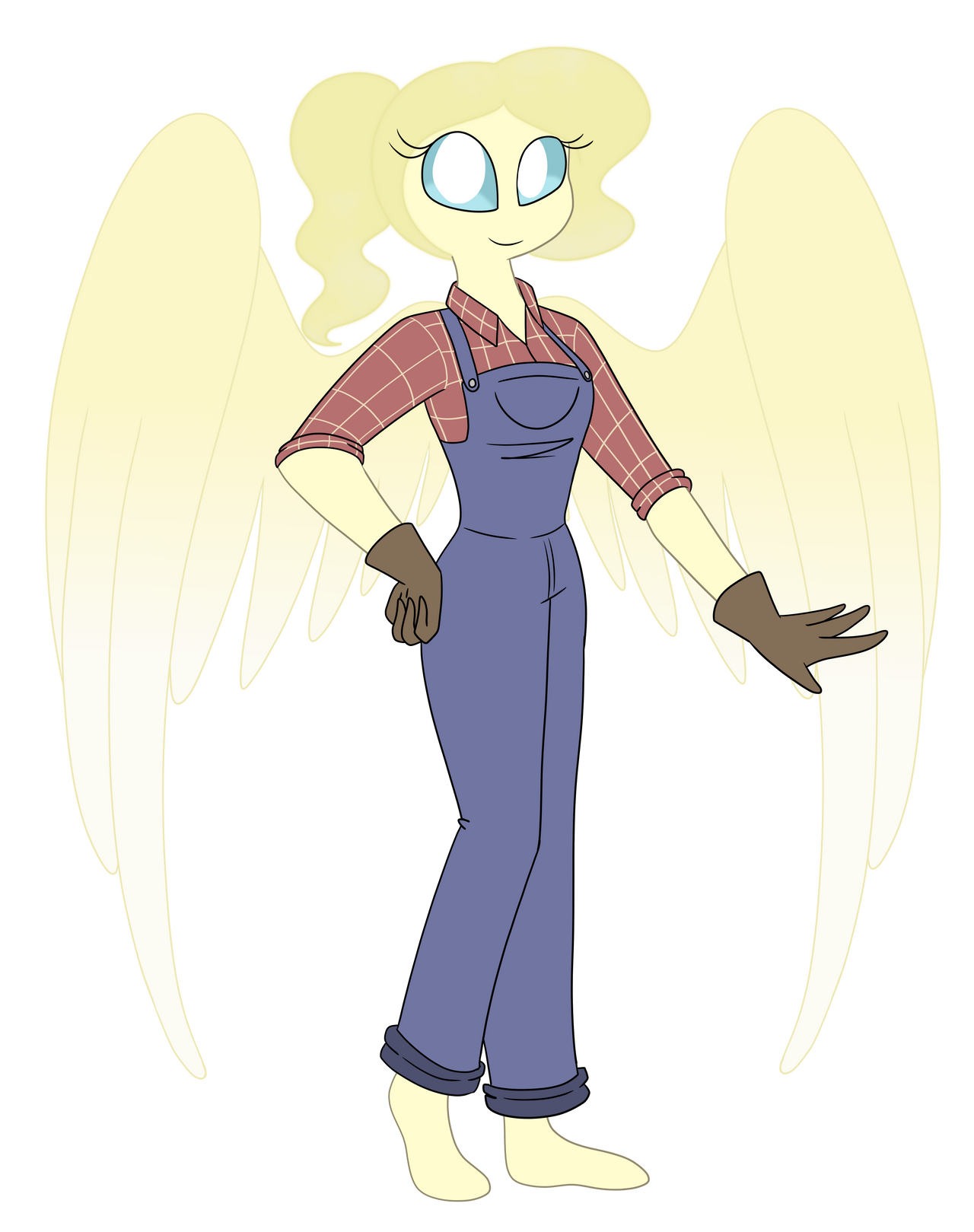 "Y-Yes sir!" the angel hollered nervously, "I'll be out in just a moment." With one more adjustment to the overalls, Solrina marched towards the door and opened it to be face to face with her employer.