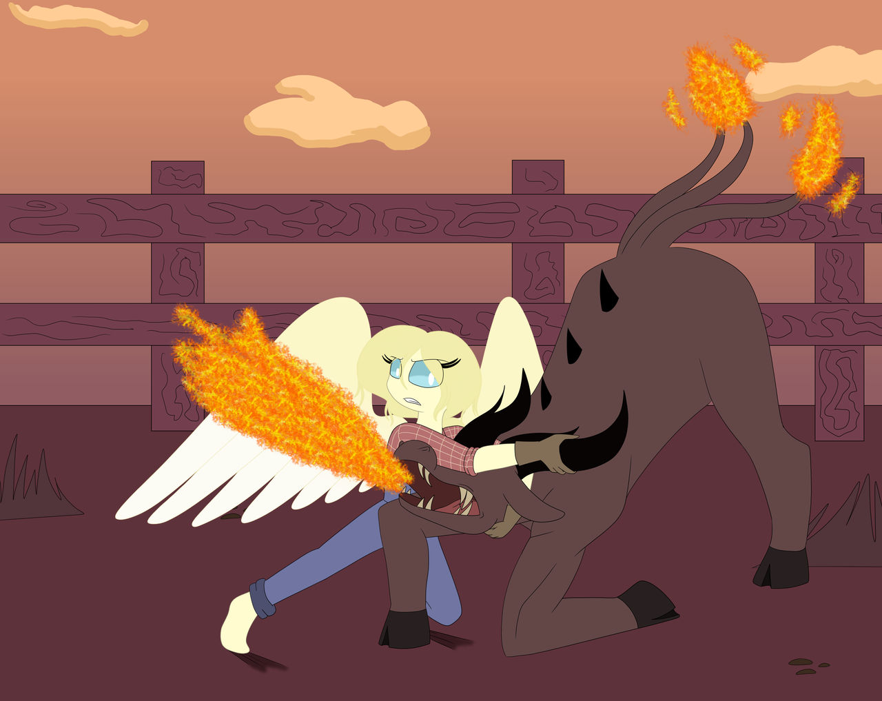 "So what do they call you?" asked the angel as she followed the cowboy imp out of the stables.