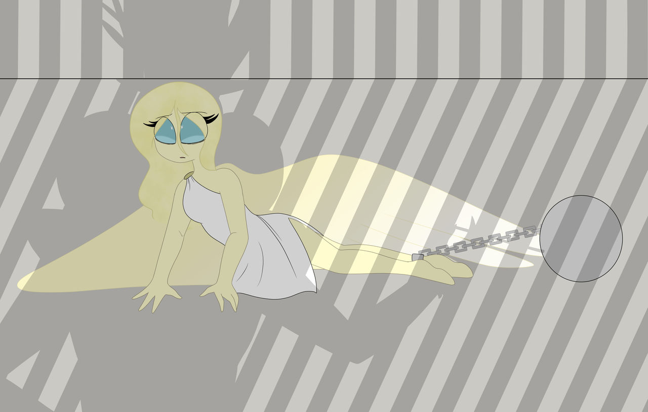 Three hours later, Solrina was back in her cage with the ball and chain back on her ankle. Her innocence still intact, but the same couldn't be said about her dress or her underwear. With nothing to cover herself, her grip on the blanket had become iron clad the moment the workers had got her into the cage. Not like anyone was brave enough to try to pry the blanket away from her since they just witnessed her burn the studio and a single sinner with just her body alone. If that was a fraction of what she was capable of, it would be best to proceed with caution around the angel. It was all this that made many of them wonder if the Vees even knew what they were doing when they decided to keep an angel against her will.