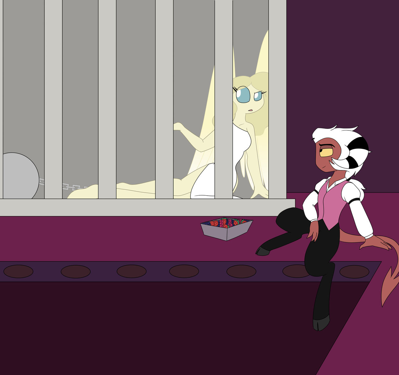 "Holy shit! Val wasn't kidding when he said he got a real angel!" shouted a voice, breaking Solrina's thoughts. Before her cage stood a pink and white spider sinner wearing a pink suit jacket and miniskirt hidden by said jacket, two different pairs of gloves covering his four arms, and boots that reached his thighs. Needless to say, Solrina thought he looked pretty. "No offense but, you look like shit for an angelic being."