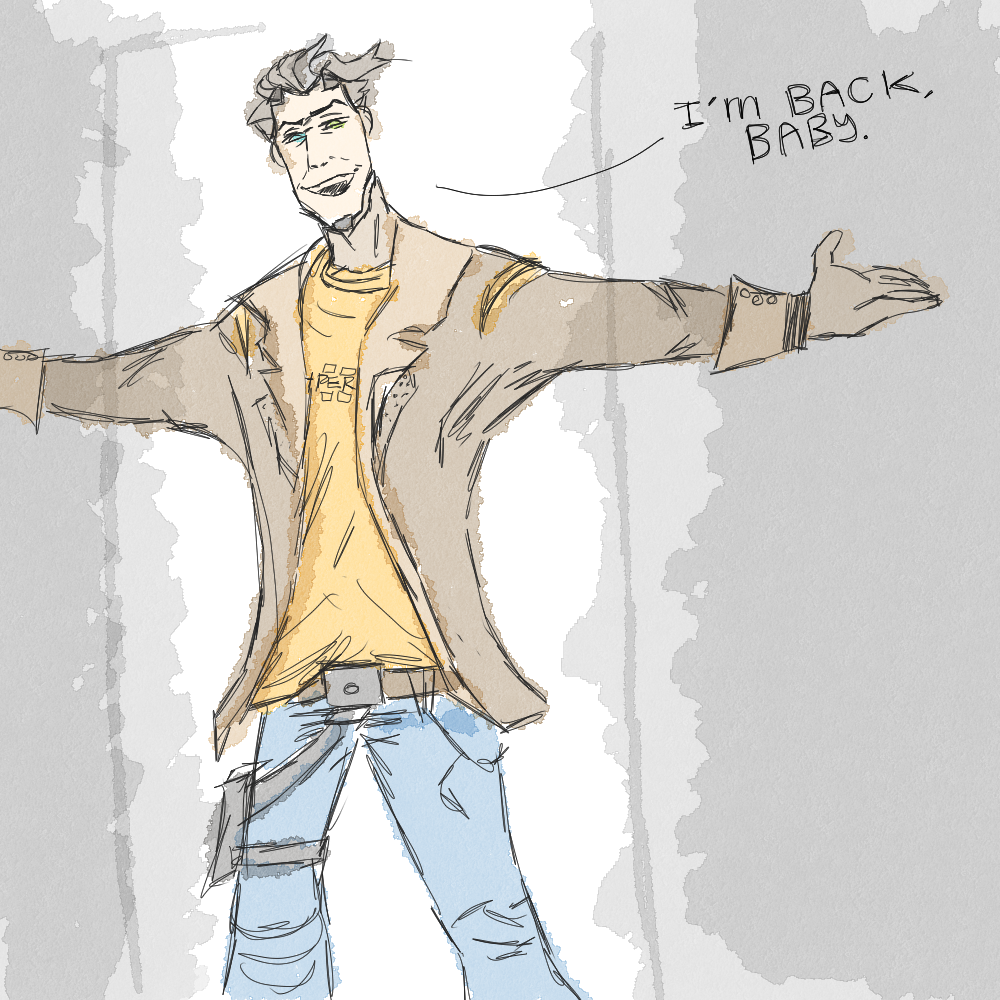 Jack waved a hand in his face, causing him to snap back to reality. Especially when he spoke. “Uh, Rhysie? You alright there?” He tilted his head before crossing his arms, Rhys nodding without a word. “Alright, then. Let’s haul ass and get my replacement… dealt with. Since they had the gall to replace me, of all people.” Jack decided, grabbing Rhys’ wrist tightly and leading him out of the medical wing of Hyperion.
