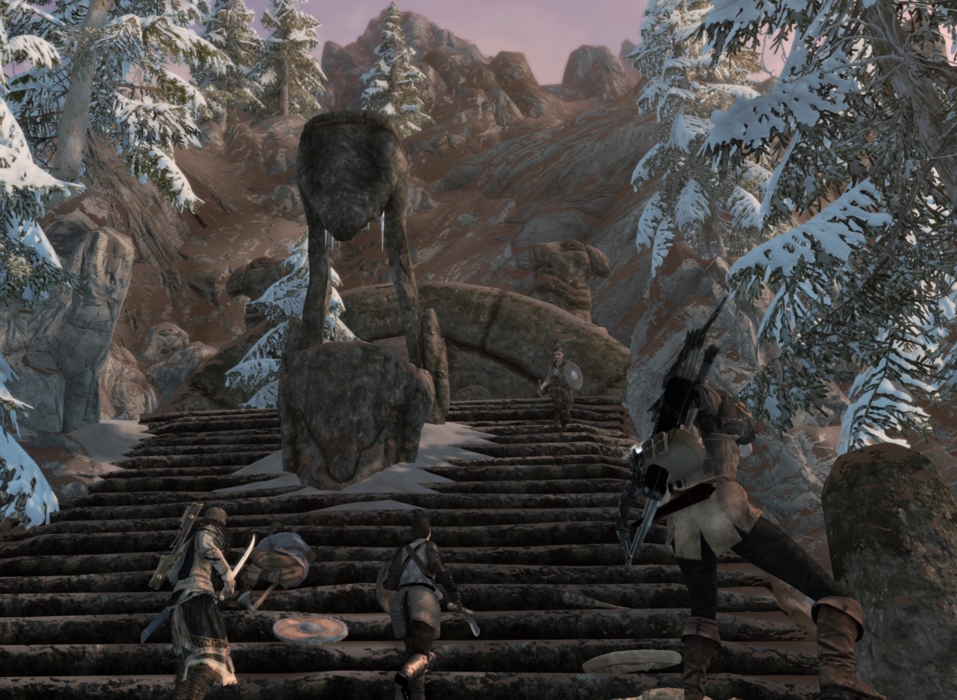 As the heavy doors of Dragonsreach creaked shut behind them, a cold gust whipped down the stone steps, stinging their cheeks. Whiterun stretched out below them, bathed in pale gold light that couldn’t quite chase the frost from the air.