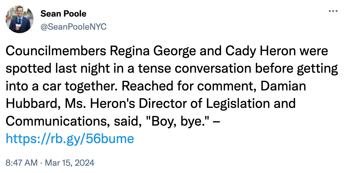 Regina George, New York City Council member representing district six in Manhattan, Cady’s co-chair of the LGBTQIA+ Caucus, and a colossal nightmare to work with.