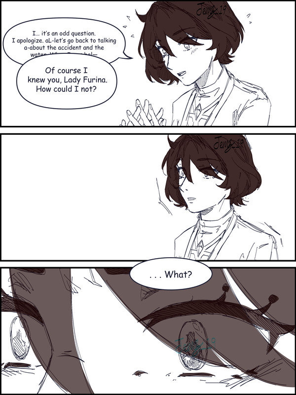 “Wai–wait, monsieur…” Furina waved her hands in front of her. Everything he was saying was too fast for her and she became dizzy trying to organize her thoughts. She took a shaky step backwards away from the man but he mirrored her and took a step forward. Despite not saying anything, she could see the man’s hand move furiously across his notepad.