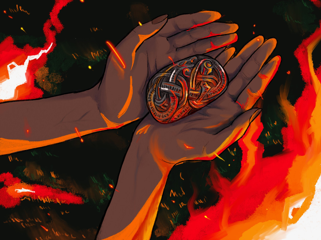 Grasping his large, bloodied fingers in between her own frail, pale ones. The woman was shrouded in firelight, her hair reflecting the light, almost gleaming like golden silk. He took a slight sharp intake of breath, certain that it was from the pain, rather than the wife of Oden had come to seal his fate as she slipped something cold between his good hand.