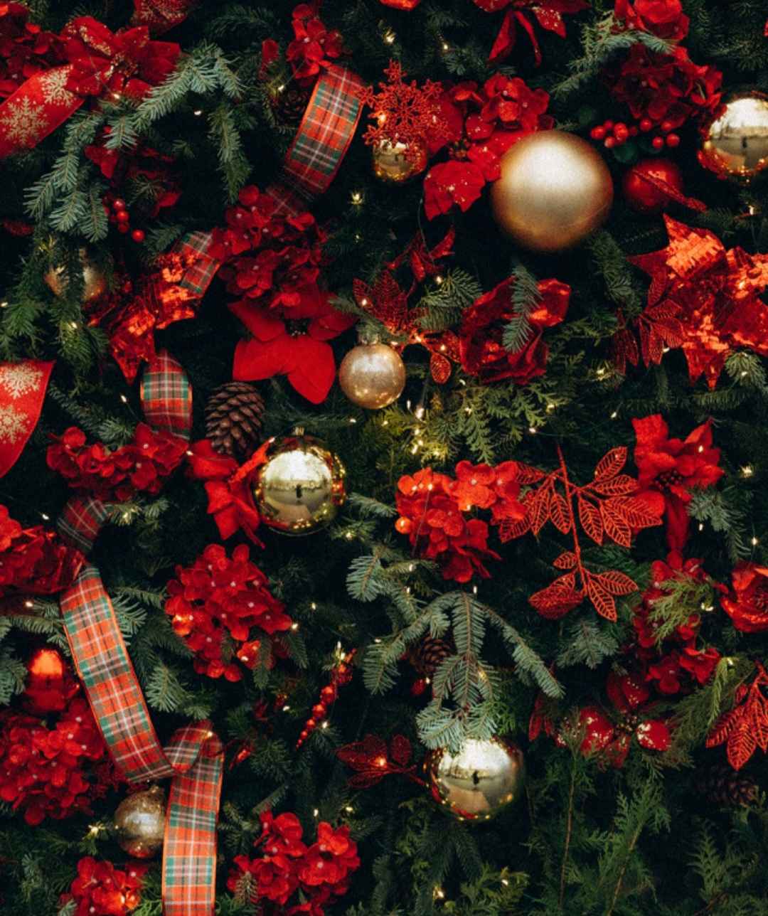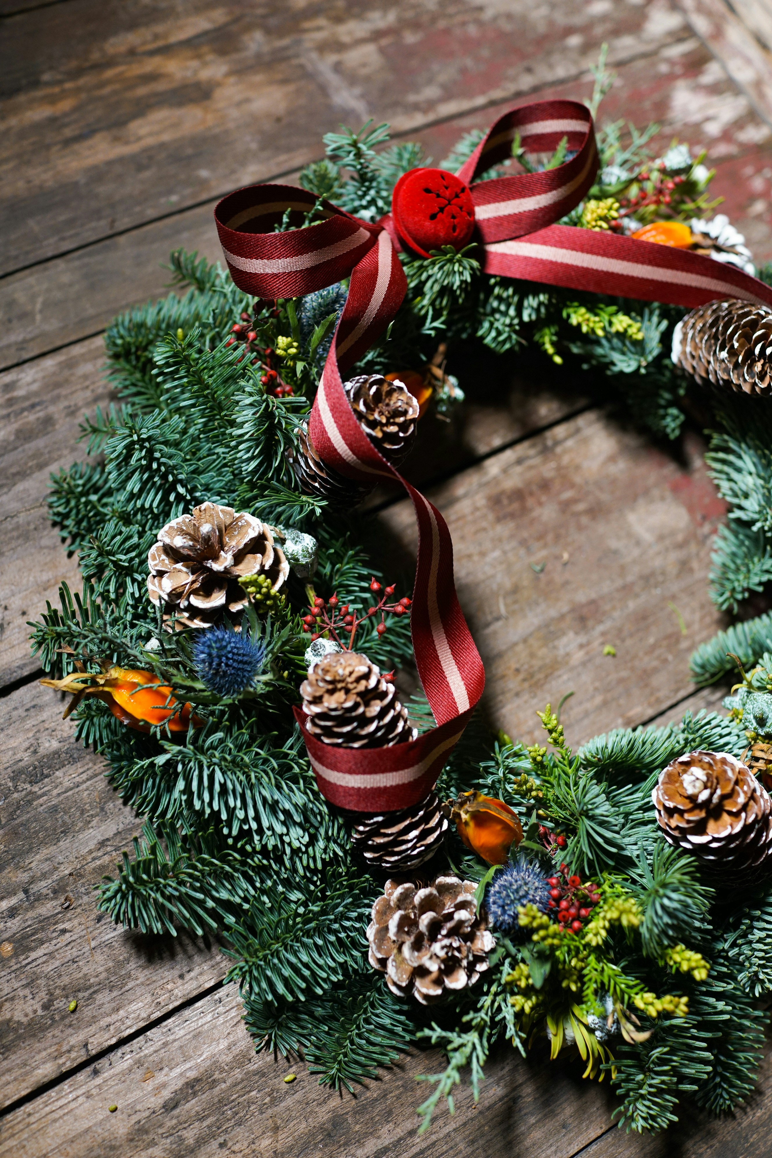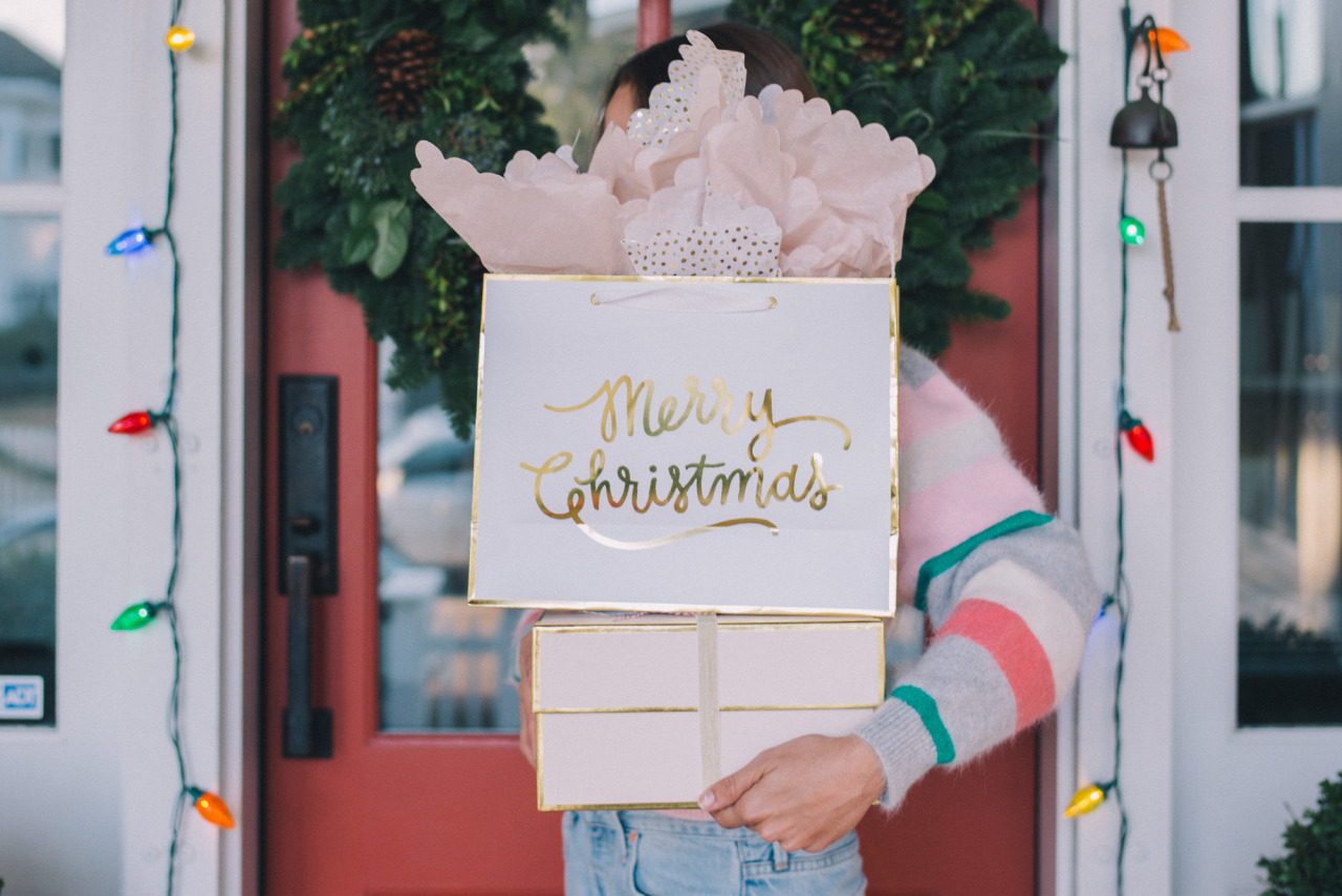 [A person is standing outdoors in front of a bright red door bearing a large wreath that has been fashioned from evergreen foliage, pine cones, and other green leaves. A single string of coloured lights surrounds the door frame. The person is wearing casual clothing - blue jeans and a striped sweater - and is carrying various gifts. On the bottom is a cream coloured box with golden edging and a single ribbon fastening, stacked on top is a white gift bag that also has golden edging and the words 'Merry Christmas' written in cursive script. Scallop-edged paper can be seen protruding from the top of the bag, entirely obscuring the person's face.]