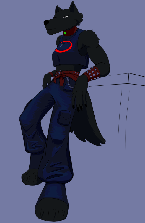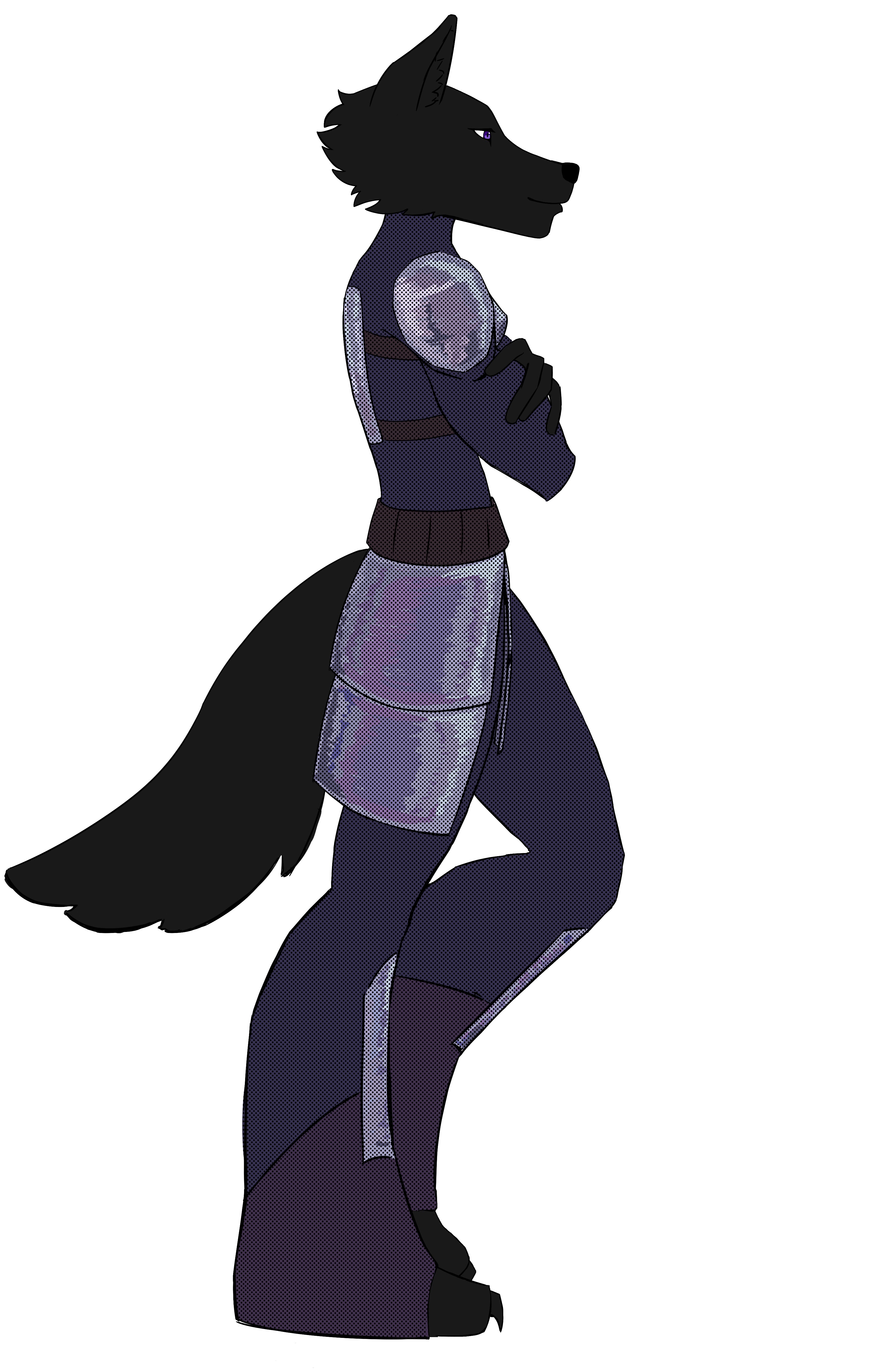 A humanoid black wolf protected by a bit of armor on her arms, legs, and chest, but is mostly clothed in a black elastic jumpsuit. Around her waist is a toolbelt attached with two Kamas and other ninja weapons, clearly matching her skilled martial art, as she easily and aggressively knocks down both Razhar and Fishface, multiple times. After a few seconds, nothing remains around her other than scattered robot parts of the foot-soldiers, and she goes to take the briefcase from the unconscious dog. Even though the briefcase weighs more than a bag of bricks, she lifts it as if it were mere paper tissues.