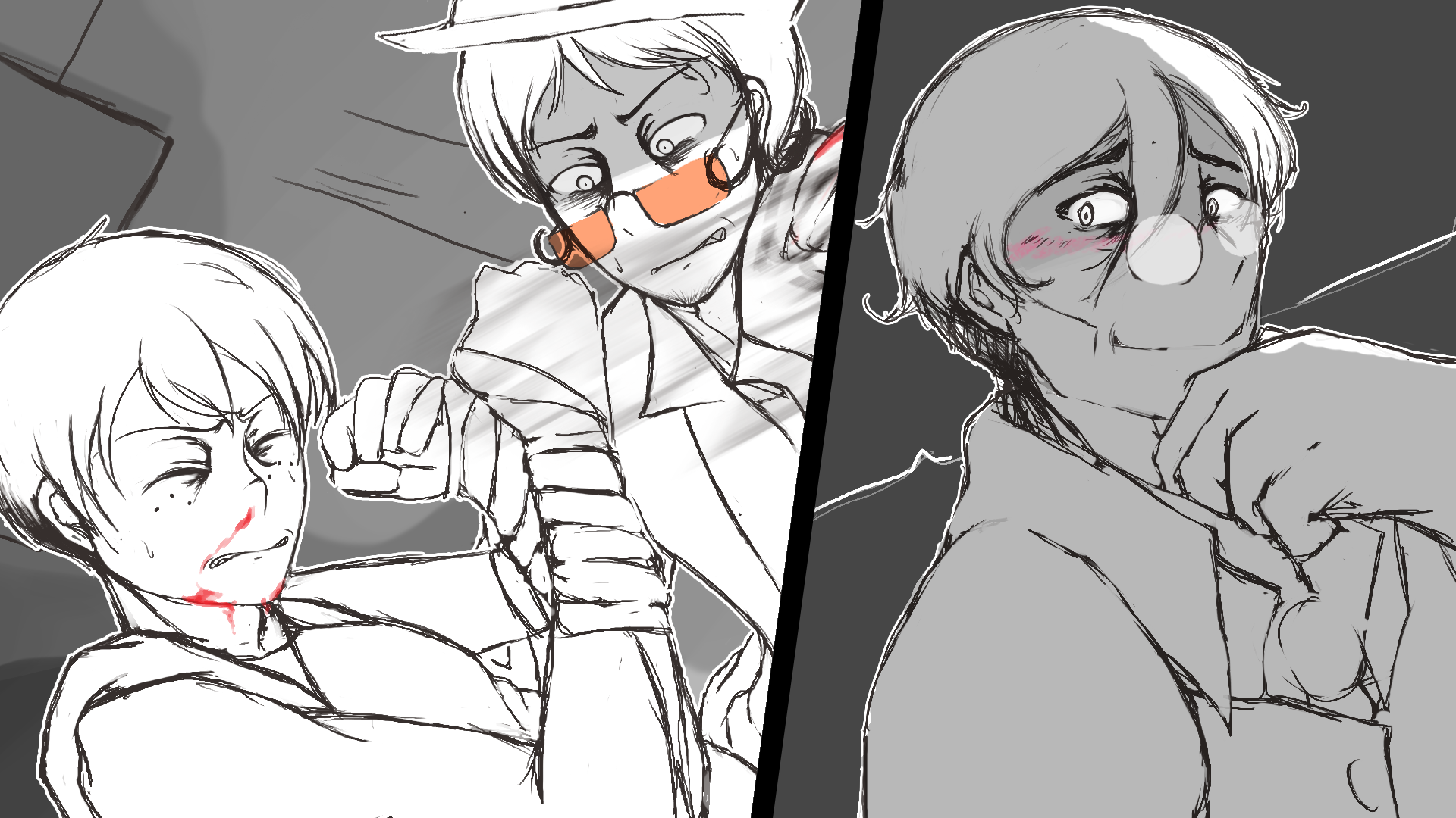 "Nien! No, no, no, no, ohoho, do tell me!" I reassured, smiling oh so giddily at him. "If you do not believe zhis is not Herr Sniper's choice, zhan what are you implying to me, Misha?” I continued to question the more he refused to respond. “Zhat I am forcing zhis medication on him? Making him kneel in front of me to suck my cock for pleasure?!"