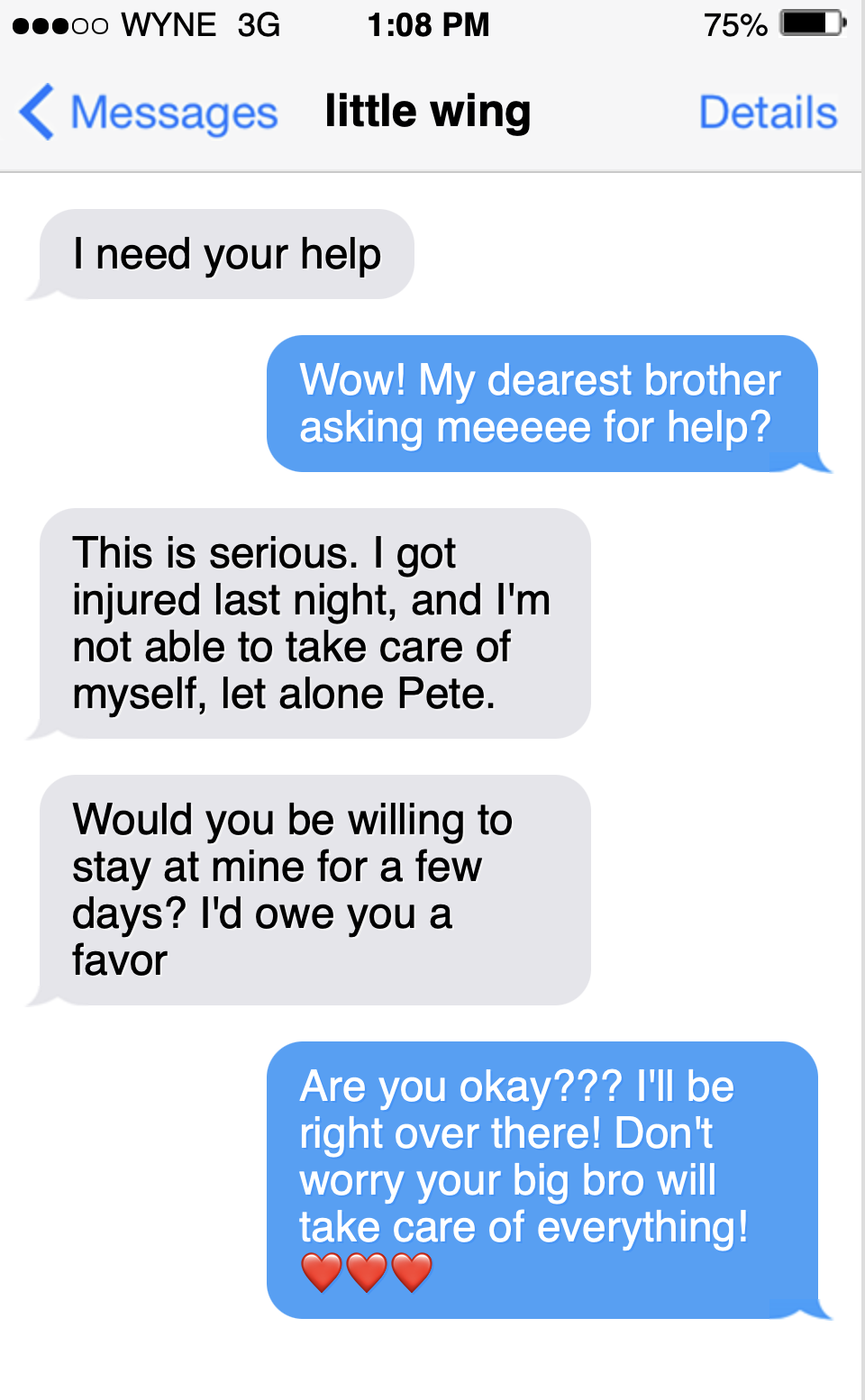 “Yeah,” Peter blushed, “I kinda feel stupid, you took me to Batburger and I literally saw over half your face. Even your hair! Not a lot of people have a white streak in their hair. I can’t believe I didn’t figure it out.” Peter grumbled.