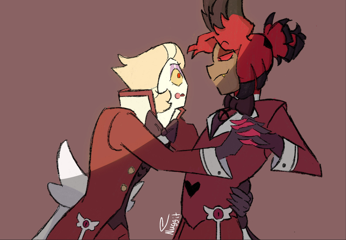 Long before Lute and Vaggie became exorcists, they were actually really good friends, but when Lute became more involved in the inner workings of Heaven, learned of the exterminations and joined the army, she became closer to Adam as one of his best exorcists. Lute grew more and more to be like Adam and his, I’ll say, aggressive self, Vaggie after letting Lute do her own thing for a few years, decided to also join the exorcists to try to “rekindle” her friendship with Lute. After joining, it became apparent that Vaggie was a way better “soldier” than Lute and Lute became very jealous as Adam started favoring Vaggie over her, thus leading to animosity between the two (Really just from Lute tbh) and the extermination Vaggie fell.