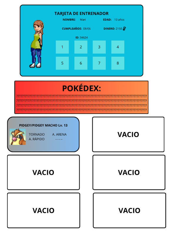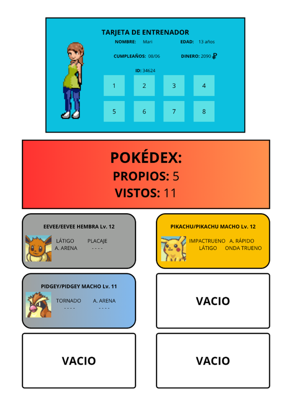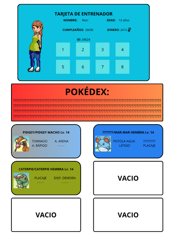Mario era un niño mimado, nunca vi a sus padres, creía que estaban en otra región, lo trataban como si fuera la perfección en persona, yo creo que porque era el nieto de Oak, pero parece que Oak no se sabía ni su nombre, su primo mayor era Azul, subcampeón de la XII edición de la Liga Pokémon de la Meseta Añil, en cambio, el hijo de la expropietaria de nuestra casa fue el que le derrotó, se llamaba Rojo 5, la hermana de Mario era algo parecida a mi madre, por eso Mario también se fue de casa de aventura a los 13. El mismo Mario me llamaba inmadura, cuando el más inmaduro era él.