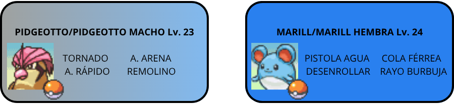 - PISTOLA AGUA y luego DESENROLLAR. - Marill se impulsó con el PISTOLA AGUA y golpeó a Pidgeotto con DESENROLLAR.