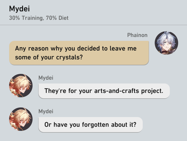 Immediately, there is an explosion of excited messages and ideas and soon, Aglaea has been pelted by at least a dozen private messages from various Crysos Heirs in less than a minute, all of them asking her for permission to go ahead with the not-surprise party and a welcome committee when Phainon finally gets to Amphoreus and everyone asks her where he should land first and–