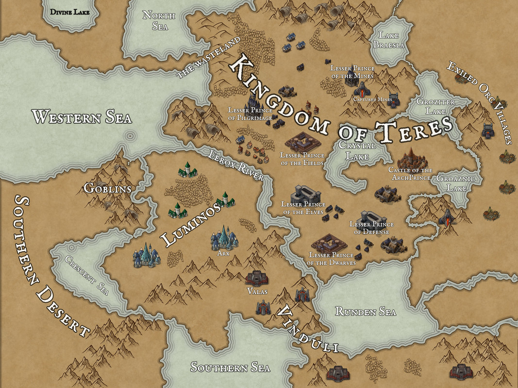 Archprince Thomas, who famously led the terens to final victory over the orcs in the teren wars, was unanimously pronounced King by his generals but had refused the title given what had happened to the last terens who had proclaimed themselves kings. Instead he chose the title archprince, the first among equals, as he called it. The archprince's seat was in the capital and he was ultimately in charge of the kingdom. The terens persisted in calling their state a kingdom despite Thomas' more humble title. There were then lesser princes who governed various aspects of teren life in the kingdom and their own castles of varying size and strength were scattered throughout the kingdom in locations that were suitable for their role.